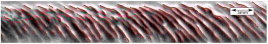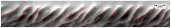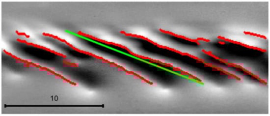 To automatically compute α, the surface angle of head checks, an edge detection algorithm was developed in such a way that the head checks in a phase image are recognized and marked by red lines (see Figure 15). These red lines correspond to the head check lines at the rail surface. The surface angle α is computed as the angle between a horizontal line along the gauge corner and an approximating straight line along the head check, see green line in Figure 15. The mean angle is calculated by averaging for all head checks in the image. The phase image in Figure 15 shows the same part of the rail as the photo in Figure 13a.