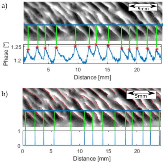 - In Figure 16a the phase profile along a line over the head checks is evaluated, and the maximum values of the profiles are counted. With the image resolution, given as pixels per mm, the average distance between two head checks is calculated. For the case in Figure 16a it gives 13 head checks for 25 mm, resulting an average distance of 1.9 mm.