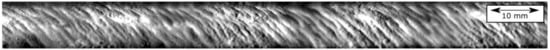- In a ‘stop-and-go’ procedure a linear table moves the rail for a certain distance between two static measurements. In one measurement a rail piece of about 25 cm is inspected, and each static measurement is separately evaluated to a phase image. For the calculation of the panoramic view of the entire rail piece, in first step a rectification of the phase images is necessary. This means that perspectivity and distortion due to the IR camera optics has to be eliminated. This was carried by usage of a calibration object, for which a chessboard similar pattern was taken. This technique will be described in more detail in a separate publication. Figure 17 shows a panorama image, which was created out of 5 overlapping static measurements for RP02. One static measurement covers an area of 440 × 1273 pixels with a resolution of 45.225 pixels/mm. Since the size of each image and the movement of the linear table is known, the images can be shifted horizontally to their approximate position. In the next step, the exact position was calculated by means of phase correlation in the overlapping area of two consecutive images, and the images were merged to form one panorama image. This step was repeated for each consecutive images to create one panorama image from the 5 separate measurements. As in this figure the cracks are not well visible due to the limited pixel resolution of a print-out, we have created a video, which is available as additional online material in Supplementary Materials to this paper.