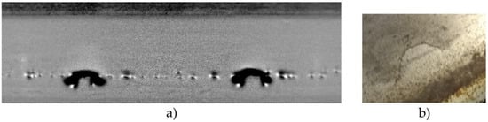 Additionally to head checks there are also other types of defects which may occur on rails. Another typical defect, called a squat, usually occurs on straight tracks; this is the opposite of head checks, which usually arise in the curves. Squats occur on the rail crown and along the rail. In a critical stage the crack has a small inclination angle below the surface, and it can cause breakouts on the rail. This kind of defect can be also very well detected by inductive thermography, as is shown in Figure 21a. The short, shallow cracks along the line can be the starting point for the later critical damage caused by squats. The two patterns with half-elliptical shape and low phase value are caused by the squats, by cracks in a half-elliptical shape. Figure 21b shows a close-up photo of the right squat. Further investigations using this technique to elucidate the development of squats are planned.