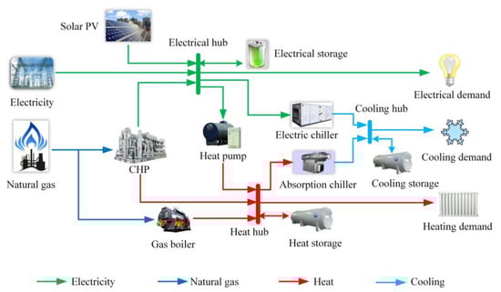 On the other hand, the energy storage systems (ESS) are known as a solution for the integrated energy systems with high VRE penetration. The authors of [20] described the role of electrical energy storage in an energy system dominated by distributed generation as well as possible modes of deployment of energy storage solutions in an industrial setting. In integrated energy systems, ESS may be used to enhance the potential energy and cost savings provided by combined heat and power (CHP) generation, if properly sized and operated [21]. In [22], authors proposed the optimal configuration of ESS in integrated energy system, taking into account reducing wind curtailment, price arbitrage, peak demand shaving and coordinated operation with CHP. In [23], the optimal schedule of battery-integrated energy systems is investigated with consideration of forecast error, and the optimal battery charging/discharging state is analytically obtained to maintain the real-time balance between supply and demand and simultaneously improve the system’s economy. A combination of applications of ESS and thermal energy storage seems more promising as it offers higher potential to achieve energy efficiency improvement and cost savings in integrated energy systems. For instance, the electrical–thermal hybrid energy storage is used for mitigating the problem of intermittency that plagues electrical and thermal renewable forms of energy in [24]. The use of the energy stored in the hybrid energy storage to supply part of the energy required by the heating load leads to a reduction of the amount of power supplied by the mains, thus reducing the microgrid operating costs. In [25], an optimal configuration method for community-integrated energy systems considering electrical and heat storage devices is proposed, which can meet the load requirements of electricity, cooling and heating in the system and ensure economic efficiency simultaneously. In [26], the effects of cold storage on the performance and efficiency of the energy hub operation cost are investigated; it is demonstrated that the ice storage performance increases the flexibility of the energy hub to apply more energy resources, which leads to the cost reduction alongside using other programs and storages. In [27], a risk-averse method for the optimal deployment of heterogeneous energy storage (HES), consisting of electrical and thermal energy storage, in a residential MEMG is proposed; results indicate that the deployment of electrical and thermal energy storage can effectively increase the system equivalent daily profit and make it more immune to the uncertainties. It is obvious from the specialized literature that integration of the heterogeneous energy storage with MEMGs has undeniable impacts on enhancement of the systems’ operation. In this paper, HES consisting of electrical, cooling and heating energy storage is exploited to provide a potentially cost-effective solution to enhance the flexibility of the MEMG system.