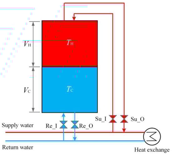 In the MEMG system, the heat storage tank and cooling storage tank are used to store heating and cooling energy, respectively. The way the HS and CS tanks work is similar, and the structure of the HS/CS tank [27] is shown in Figure 2. The HS (or CS) tank absorbs or releases heat (or cooling) energy by controlling the volume of hot or cold water ( or ). When a heat storage tank supplies heat, the temperature of the supply water () becomes higher. When a cooling storage tank supplies cooling, the temperature of return water () becomes higher.