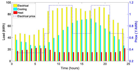 Electrical/cooling/heating load profiles for a typical summer day and electrical price curve.