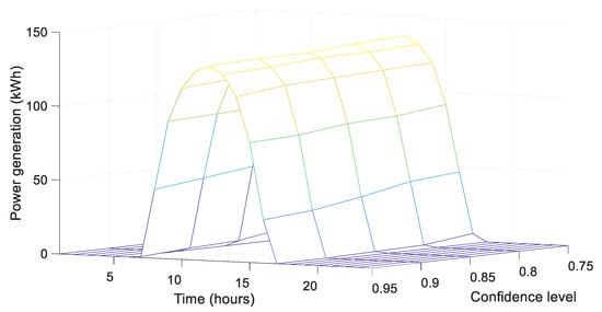 The minimum configuration of IDR (expressed as a percentage) corresponding to the complete accommodation of PV at different confidence levels within the MEMG system is shown in Table 2. As shown in the Table 2, the higher the confidence level, the smaller the configuration of IDR, and hence there are lesser amounts of load shift and IDR cost. This is because by increasing the confidence level, available PV power obtained is decreasing according to the p-efficient point theory, which can be observed from Figure 5. The energy purchase cost and total cost of the MEMG system under different confidence levels are also shown in Table 2. With the increase of the confidence level, available PV power as well as the corresponding IDR configuration are reduced, which leads to the increase of energy purchase cost and total cost.