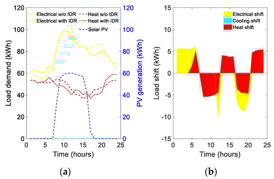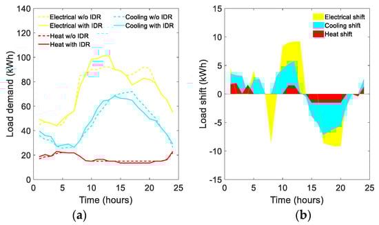 The optimized electrical, cooling and heating load profiles with and without considering IDR are comparatively studied in Figure 6a. The shift amount of electrical, cooling and heating loads in the entire scheduling period, i.e., a 24-h period on an hourly basis, is indicated in Figure 6b.