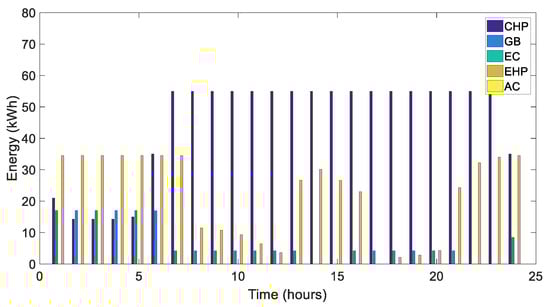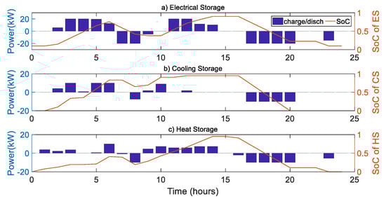In this set of tests, the cooling is mainly used for the space cooling. The EC equipped in the system is the main cooling unit to produce cooling energy. Shown in Figure 7 is the optimized operation state of the energy conversion facilities over a 24-h period on an hourly basis. Figure 8 illustrates the cooperative operation of the ES, CS and HS.
