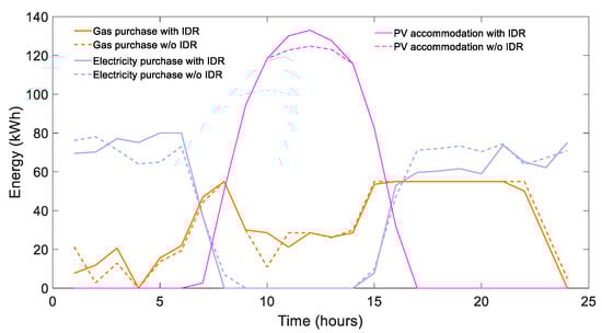 Electricity purchased from the main grid, gas purchased from the gas network and PV power accommodation under the optimization framework with and without considering IDR are comparatively studied in Figure 9. We can learn from the figure that the amount of the purchased electricity increased in the valley periods, e.g., 3–7, and reduced at the peak periods, e.g., 17–20, because of the presence of IDR and HES. There is a little difference in the amount of purchased gas because the gas price is considered to be fixed. The optimal daily cost of the studied system, which includes the electricity purchase cost from the main grid and gas consumption cost of the CHP and GB is attained as 881.3¥, which was 932.044¥ without considering IDR. This represents a reduction of 5.44% in the energy purchasing cost.