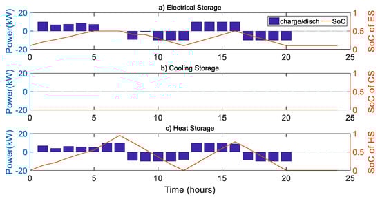 In valley periods, e.g., 1–7, as the electricity is cheap, more electricity is purchased, the cooling energy is produced by the EC, and the heat energy is produced by the EH. Excess capacity is stored in the HES for future usage during peak hours, e.g., periods 17–20, as indicated in Figure 8. In peak periods, e.g., 17–20, as the electricity has a higher price, less electricity is purchased and the MEMG switches to consuming gas and producing power and heat using the CHP. During the period, the AC equipped in the system converts heat energy to output cooling energy to supply part of the cooling load demand while reducing the cooling energy produced by the EC to save cost.