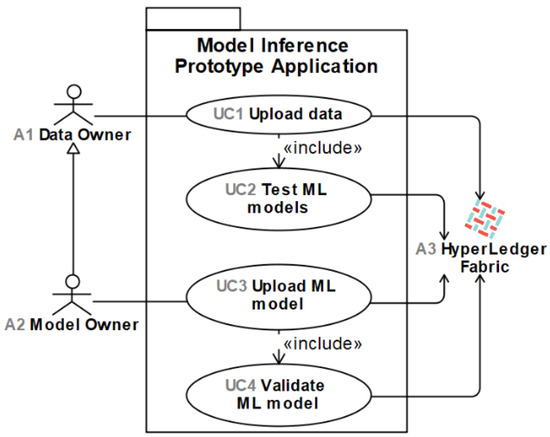 In our model inference prototype, two types of stakeholders exist (Figure 2). The data owner (A1) can upload evaluation data (UC1) to the prototype application, which is used for new model validation and testing of already existing models. The model owner (A2) can upload the model (UC3), which once validated is committed to the blockchain. Additionally, Hyperledger Fabric (A3) participates in all use cases (UC1-4), as an external network, which is responsible for transaction recording. Either type of user acts as a participant during the data or model upload processes, and only after the majority of participants approve the transaction, it is committed to the blockchain.