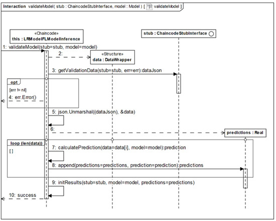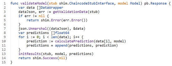 Model validation (Figure 2 UC4) begins after the model is uploaded to the blockchain (Figure 2—UC3). Once the validateModel function is called, a new instance of the DataWrapper array is created. Afterwards, the JSON data (in the form of a byte array) from the ledger are selected (Figure 4—messages 2–3, Figure 5—lines 2–3), and if the selection is successful the validation continues. Otherwise, once the error object is populated, the validateModel function returns a failure message (Figure 4—opt fragment, message 4, Figure 5—lines 4–6). Afterwards, the JSON data and structure are mapped using the JSON library package function (Figure 4—message 5, Figure 5—line 7). Then, one more instance is instantiated—an array of float type (Figure 4—message 6, Figure 5—line 8). Once the required variable instance is constructed, a prediction is calculated for each validation data record and the model parameters. Considering that the prediction is calculated for each data validation record, a loop fragment is used. Inside a loop, a separate method for the prediction calculation is used and each calculated prediction is appended to the previously instantiated float type array (Figure 4—loop fragment, messages 7–8, Figure 5—lines 9–12). Once all the predictions for all DataWrapper records are calculated, the calculated predictions for a specific model are saved in the blockchain ledger using the shim library [34], and finally, the success message is returned (Figure 4—message 9–10, Figure 5—lines 13–14).