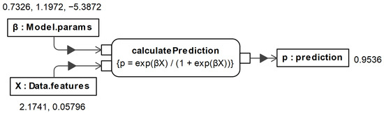 The execution of the validateModel function relies heavily on the calculatePrediction function, where the logic of model inference resides. The running example of the logistic regression inference is demonstrated in Figure 6, which depicts how prediction is obtained for a single data row using a pre-trained model. As it can be noticed, the prediction got very close to the ground truth.