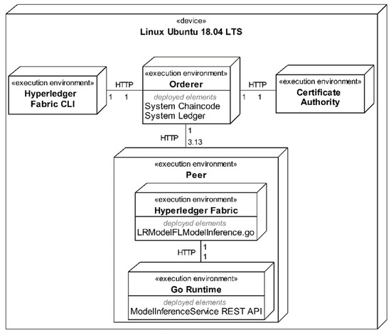 The deployment architecture of the model inference prototype is presented in Figure 7. The main components were hosted on a Linux Ubuntu server using Docker [36] containers. Hyperledger Fabric CLI (command-line interface) was deployed into a node, which was used to experiment by calling chaincode functions. The CLI was linked to the Orderer service and Certificate authority, which issues certificates. The Orderer regulates the transaction, commits among peers, and controls the chaincode execution order. Each of the peer nodes had a Hyperledger solution deployed, which consisted of a model inference chaincode and local ledger copy. Alongside the Hyperledger Fabric solution, a model inference web service was deployed to each node to accurately judge the performance of the oracle web service against the entirely blockchain-based solution.