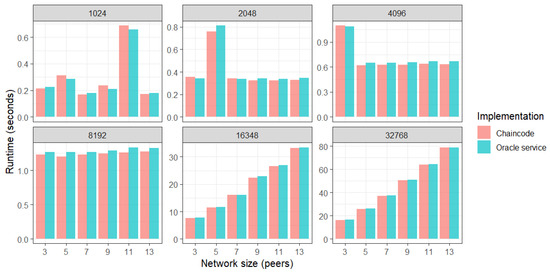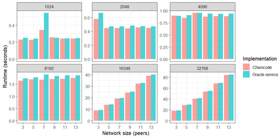 The preparation step for the model validation use case experiment was uploading validation data to Hyperledger CouchDB through the chaincode. During the experiment, the peers uploaded their models. The uploaded models were validated using chaincode and the runtime of the validation function was measured. Blockchain was restarted and then the function that uses the oracle component rather than the chaincode was called, measuring the oracle service runtime. The median runtimes for all the tested network and data sizes are presented in Figure 8, where the bar plots indicate that the model inference time substantially increases after the dataset size reaches more than 8192 rows. Surprisingly, the linear increase in runtime with respect to the network size can only be noticed when testing on large datasets containing 16,348 or 32,768 rows.