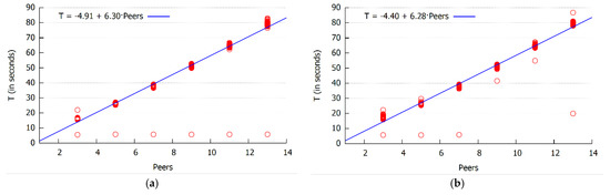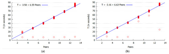 Model inference runtime (in seconds) in relation to the network size for the largest variant of the synthetic dataset: Chaincode (a) and oracle service (b) results. The linear relationship is evident where an additional peer in the network increases runtime T by 6.3 s for the chaincode and 6.28 s for the oracle service.