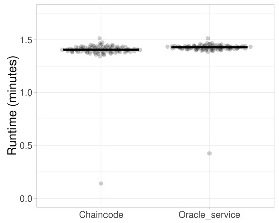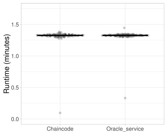 The largest runtimes at the extreme scenario of large network and data settings are shown in Figure 13. The initial runs for both validation types provided the least amount of validation time clearly describing the overhead introduced by the oracle service. All sequential validation run results clustered around the validation time of 1 min and 24 s for the chaincode validation and around 1 min 25 s for the oracle service validation.