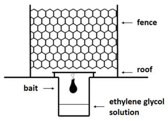 Modified Barber traps (Figure 2 and Figure 3) were used for catching the adult carrion beetles (Coleoptera: Silphidae). Four traps were set up on the test sites and were dug in line with the soil surface. Containers were filled one-third with ethylene glycol solution. The traps were covered with a plastic lid to prevent excessive contamination from rain and vegetation (e.g., falling leaves). On the roof, a bait was attached with a wire, it consisted of pieces of chicken weighing about 100 g. The trap was additionally surrounded with a metal mesh to prevent predators (e.g., foxes, cats, dogs, and birds) from eating the bait and destroying them. Holes in the metal mesh were approximately 2 cm, which allowed the beetles to pass into the trap with bait without thereby affecting the catchability of the insects. The same type of bait was used at each site, with an average weight of 100 g. The research was carried out from May to October. The traps were emptied on average every two weeks, and the preservative fluid was changed and a new bait was put out. The captured entomological material was then analyzed.
