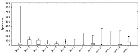 The obtained specimens were classified into 13 species and 5 genera, which according to Löbl and Löbl [], account for 59% of the Polish Silphidae fauna. In total, 876 samples were analyzed. Statistically significant differences were found between the number of specimens caught at individual sites (p < 0.05). However, no differences in the number of species were found (p = 0.9828).
