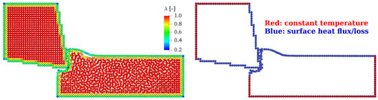 In this algorithm, the parameter is calculated as the minimum eigenvalue of the matrix in Equation (14), also known as the Randles–Liberky [] renormalization matrix. Theoretically, the values of vary from 0 to 1 for exterior and interior particles, respectively. Preliminary studies by the authors of [] demonstrated that taking a is generally a proper choice as it isolates at least one layer of surface particles. Figure 2 confirms this by displaying one example frame of an orthogonal cutting simulation with SPH, where the surface detection algorithm is active in the code. It demonstrates how the surface particles required for thermal boundary conditions can be effectively identified using this algorithm. Another advantage of detecting surface particles is linked with the stability of the Laplacian formulation. That is, Fatehi’s Laplacian operator Equation (13) is computed for interior particles (), and the approximation of the heat equation for all surface particles falls back to Brookshaw’s method in Equation (4). By doing so, the singularity of correction matrices in FMFS can be avoided. This matter has been elaborated by Afrasiabi et al. [] in several 3D heat conduction benchmark tests.