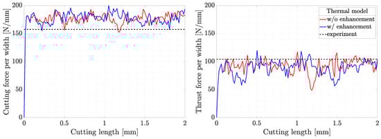 According to the thrust force plot in Figure 5, the overall maximum discrepancy between the experimental and numerical results produces an error of 53% underprediction for SPH with the reference model (see the red line at about 1.2 mm cutting length). When using the proposed model, this value is reduced to 45% and occurs slightly before 1.5 mm of the cutting length. At first glance, this discrepancy may not be within an acceptable range for some applications such as precision machining. Nevertheless, the community of SPH cutting simulations typically consider an average error of force prediction to verify their numerical results and not the maximum value, see, e.g., in [,,].