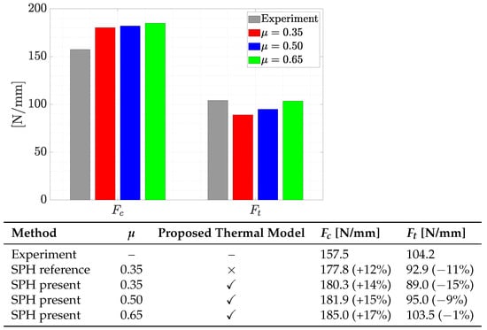 Given the measured forces in Figure 6, the friction coefficient corresponding to the experimental and is equal to 0.66, whereas was initially taken for the SPH simulation. Therefore, two additional simulations are carried out using and to gain further insights. Figure 6 shows a quantitative comparison of these simulated forces in a bar chart, where the present thermal model is used. As expected, the effect of on is higher than , resulting in the best prediction of when . It is because the friction model in this cutting geometry with a rake angle of 0 degrees has the most significant influence on the magnitude of . Although not very significant, the choice of was found to have impact also on the simulated chip shapes.
