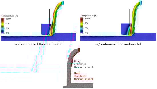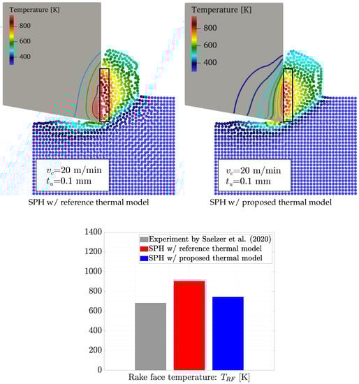 Shown in Figure 8 are the SPH results employing different thermal models, as well as a comparison of the rake face temperatures. The bar chart in this figure compares the predicted temperatures with the experimentally measured data from [], which can, in turn, verify the correctness of the proposed thermal model. The red and blue bars are the arithmetic mean temperature of particles located inside the indicated black frames at the rake face, corresponding to 905 K and 744 K, respectively. Using the enhanced thermal model decreases the overprediction error of from 33% to 9% and leads to a more accurate simulation. This improvement is gained by the more realistic thermal boundary conditions in the proposed model and the utilization of a higher-order Laplacian operator.