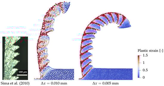 Previous studies have also investigated the influence of discretization size on SPH metal cutting results. For instance, the authors of [] focused on this subject and presented a new framework for SPH metal cutting models with variable particle size. They showed that the size of SPH particles has a significant impact on the predicted chip shapes. Figure 10 demonstrates this finding, where the chip shape produced by smaller size SPH particles (i.e., the high-resolution case with mm) is much closer to the serrated chip shape observed in the experiment. This, in turn, serves as a qualitative measure of convergence of the method for chip prediction.
