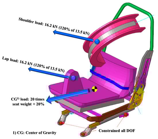 The load condition included the shoulder/lap loads and the inertial load shown in Figure 1 based on ECE R14 regulations. The shoulder/lab load of 1350 N was applied to the shoulder/lab blocks in contact with the seat belt, and at the same time the inertial load equal to 20 times the weight of the seat was applied to the entire center of gravity considering the application angle of 10°. All the maximum loads were applied instantaneously at the same time, and simulation was performed for 0.08 s while the maximum load was maintained. Contact conditions were applied to all parts of the analysis model so that the initial loadings applied to the seat belt could be transmitted to the entire structure of the seat frame, as well as the seat belt anchorage points and the seat frame constraint points. The boundary condition was implemented by constraining all the degrees of freedom of each of the mount points, which are bolted on the front and rear brackets among the seat assembly parts, as shown in Figure 4b.