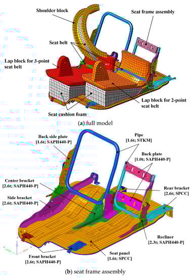 The material and initial design thickness dimensions of the seat frame considered in the RDO were shown in Figure 4b. The seat frame assembly of the FEA model was generated with shell elements, and the shoulder block, the lap blocks and the seat cushion foams were generated as solid elements. The seat belts were generated with shell and 1-D seat belt elements. Rigid link elements were used to connect each seat structural part. The surface contact conditions were applied to all the parts where the contact behavior would occur. The numbers of elements and nodes of the FEA model were 21,591 and 22,601, respectively. The principal material properties of the FEA model are summarized in Table 2.