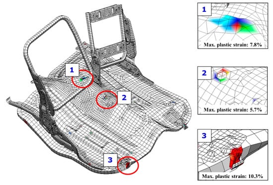 In the numerical simulation of the seat belt anchorage strength, the maximum plastic strain and dynamic deformation were calculated using LS-DYNA/Explicit, a general-purpose FEA program. The partial rupture or breakage of any anchorage or surrounding area under the required force was investigated from the plastic strain contour results at the final simulation step. The plastic strain contour results are presented in Figure 5.