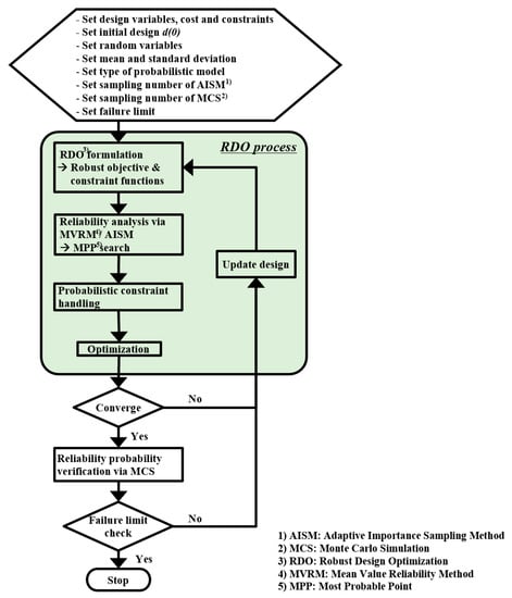 In this study, an enhanced RDO method that is able to compute the reliability probability of the constraint in the RDO process was developed, and the proposed RDO procedure is shown in Figure 7. As represented in Figure 7, in order to quantitatively guarantee the robustness of the constraint, the robustness of the objective function and the constraint were considered using not only mean and standard deviation, but reliability analysis methods such as MVRM and AISM were also applied to the constraint. Additionally, the probability of reliability was evaluated for the converged optimum results using the MCS to verify the actual reliability.