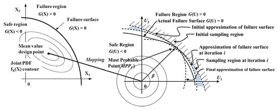 In the AISM, the failure region for the constraint function is approximated as a second order polynomial using principal curvature, as shown in Figure 8. The curvature value is repeatedly updated to include the fracture region based on the number of samples existing in the fracture region. In Figure 8, the reliability index is denoted as β .