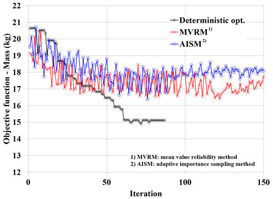 In order to complete the optimization procedure, each calculation time required by the RDO with MVRM, the RDO with AISM, and the deterministic optimization, was 433.417 h, 1601.483 h, and 20.417 h, respectively, using a server machine which has 6 core Intel Xeon CPU and 128 GB RAM. As represented in Table 4 and Table 5, the RDO results of the seat frame design using the MVRM and the AISM all showed conservative design results as compared to the deterministic optimal design results. The weight reduction results using the RDO with the MVRM and the AISM were 3.4% and 1.7%, respectively, based on the initial design weight of 18.38 kg, while the weight reduction of the deterministic optimal design was 17.8%. In the context of the constraint function results for the plastic strain, the RDO with the MVRM and the AISM ensured a safety margin of more than 50% based on the upper limit value of constraint, while the deterministic optimal design was only 6%, which was nearly approaching the failure limit. Regarding the constraint function results for the dynamic deformation, the RDO with the MVRM and the AISM secured a safety margin of about 20% based on the upper limit value of constraint, while the deterministic optimal design was active at the limit value. Reviewing the RDO results according to the reliability analysis method, we see that the RDO results with the AISM were more conservative than the MVRM. The probabilistic optimal design results of t2, t5, t7, and t8 were different according to the reliability analysis method, while there were no differences in the results of the remaining design variables. As described above, it was found that the robustness result for the converged probabilistic optimal design were varied according to the reliability analysis method. The numerical cost was compared based on the number of function evaluations, and the AISM case was the highest because the number of samples increased for the search of the failure region during the reliability analysis. The results of optimization-convergent characteristics were compared for the objective function and the constraint functions, respectively, and are shown in Figure 9 and Figure 10.