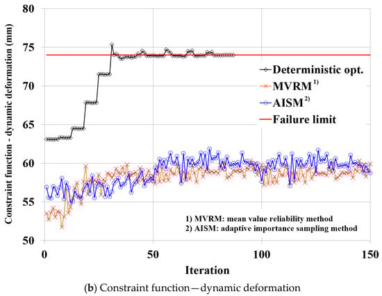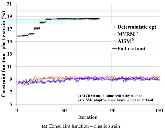 As shown in Figure 9 and Figure 10, since the reliability analysis was applied to the RDO during the optimization process, the convergence characteristics differ from that of the deterministic optimization. Comparing the results of the MVRM and the AISM, the AISM represented more conservative results than the MVRM in the entire convergence process of both the objective function and the constraint function, and a more conservative convergence characteristic in the constraint function for the plastic strain. In the deterministic optimization, since the uncertainty of the design variable was not included, it was found that the constraint function for the dynamic deformation at the optimal design point was active at the failure limit.