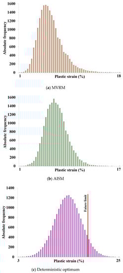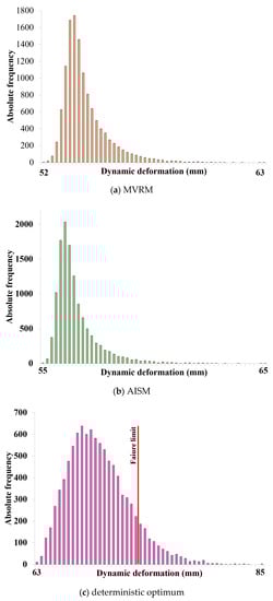 As shown in Table 6 and Figure 11 and Figure 12, the probability of failure for the probabilistic optimal design of the RDO using the MVRM and the AISM all presented results of three sigma or higher. However, since the probabilities of failure in the deterministic optimal design were 10.3% for the constraint function of the plastic strain and 26.3% for the constraint function of the dynamic deformation, with the deterministic optimization it was difficult to guarantee adequate structural safety in cases wherein the design uncertainty was included. In the case of the RDO with the AISM, the probability of failure was evaluated as 0.0% for all the constraint functions, so the most reliable structure safety was guaranteed.