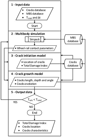 This section proposes a methodology for the prediction of cracks due to RCF. This methodology is based on the integration of three types of models: Multibody modeling (Section 2.2), RCF crack initiation (Section 2.3) and RCF crack propagation (Section 2.4). The methodology is implemented in Matlab®, where calls to several processes of the MBS software and the mathematical computing of the physical models are carried out. The flowchart of Figure 1 shows the methodology process, divided into five main sections explained in the subsections below.