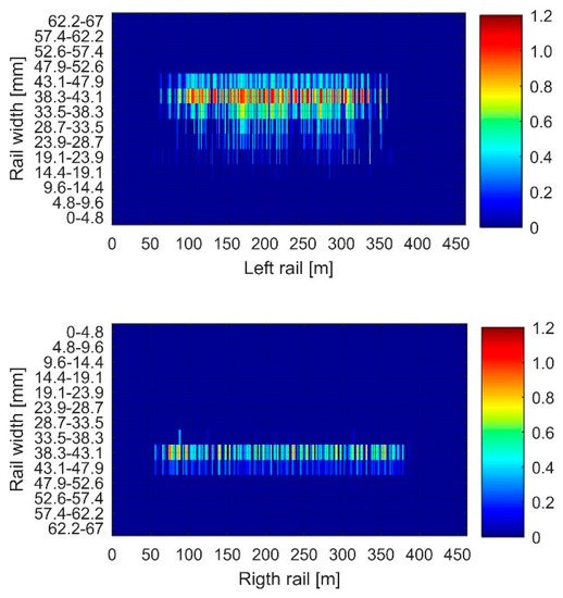 The methodology has been applied in two different sections of the railway line. Figure 9 shows the track geometry of these two curved sections, whose location is close to one of those used in Burstow’s study. Thus, the implemented damage function is valid for this experimental validation. For other locations, the methodology is valid updating the damage function. The characteristics of these sections are suitable to show the influence of the curve radii on the appearance of RCF cracks. This statement is based on recommendations in the Innotrack report [44] regarding the use of standard grade rails, for which the curve radii threshold for RCF is between 700 m and 1000 m on lightly loaded tracks (<10 MTn/year). The loading condition has been set to cover the daily average load. A constant friction coefficient of 0.5 is used in the wheel-rail contact to replicate the dry conditions [46], i.e., without flange lubrication. Traction has been neglected for simplicity, as the train travels at constant speed. The detailed information about the case study parameters is listed in Table 2.