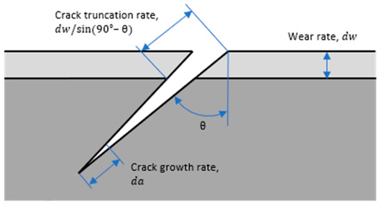 This work from KRRI employs Fletcher and Kapoor’s “2.5D” fatigue crack growth model [41], which performs calculations with the SIF procedure [42]. With the use of Green’s functions, it is possible to determine the crack propagation as a function of the crack depth for a known traction coefficient and creepages. In addition, this model takes into account the wear rate using the popular Archard’s model. Therefore, the calculated crack will be the net crack (Figure 5) considering