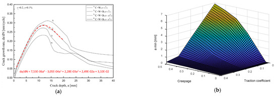 Database values from [21] results: (a) Crack growth fourth-degree polynomial considering contact stress and wear (tc = 0.2 and γ = 0.1%); (b) Minimum crack length for different creepages and traction coefficients.