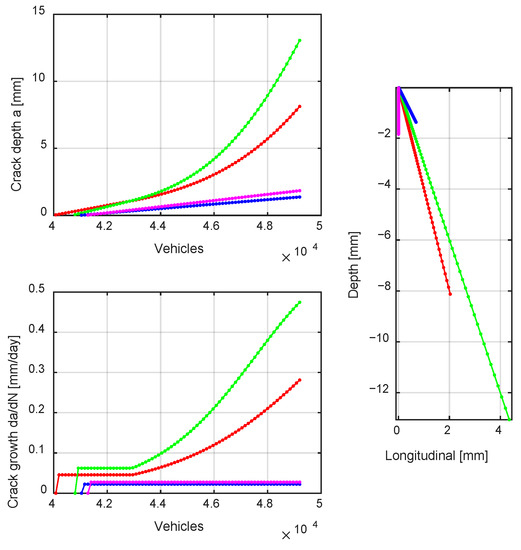 The crack growth model allows predicting the future characteristics of an already existent crack under some conditions. The developed methodology is based on the work of the Korea Railroad Research Institute (KRRI) [21] to calculate the minimum crack size for growth under rolling contact between wheel and rail. Owing to the crack truncation rate, a minimum crack size is needed to allow propagation. KRRI model considers physically small cracks that eventually become long cracks. The purpose of their work is not the investigation of the growth of microstructurally or mechanically small cracks. According to KRRI work, our methodology uses a minimum crack size value derived from the traction coefficient and creepages in the wheel-rail contact point. Then, for an existing new crack, whose length has already been predicted, the crack growth rate will be a function of the crack depth. This dependence will be again related to the traction coefficient and creepages in the wheel-rail contact point.