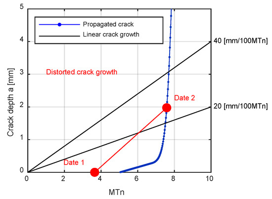 Innotrack’s report [44] considered that cracks grow at a constant rate in contrast to the actual non-linearity of crack growth. However, it is problematic to consider a linear crack growth when making comparisons between only two dates. Figure 8 shows an example of this issue with a hypothetical propagated crack (in blue dotted line) which has different linear growth rates (black lines) throughout its propagation. Since cracks are detected for a certain number of million gross tons (MTn) from the last grinding, inspections carried out previously (Date 1) cannot measure any crack. If a later second inspection detects a crack (Date 2), a distorted crack growth rate is obtained from Date 1. Besides that for the same number of MTn, cracks of different depths will eventually appear due to the traction coefficients and creepages.