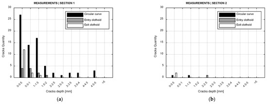 Number of cracks measured as a function of their depth, grouped by curvature type: (a) Section 1; (b) Section 2.