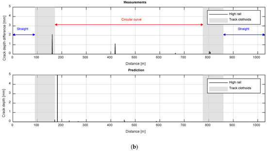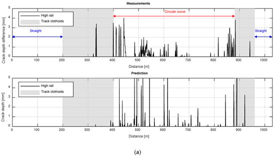 The predicted RCF behavior, using the methodology described in this paper, is similar to the measurements for both assessed case studies. Figure 12 shows a qualitative comparison between measured and predicted locations of cracks in Sections 1a and 2b, respectively. The three main conclusions are also:
