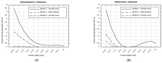 Location comparison between predicted and measured cracks for 4.752 MTn: (a) Section 1; (b) Section 2.