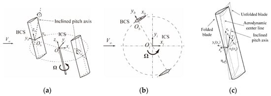 Different coordinate system arrangements: (a) inertial coordinate system (ICS) and unfolded blade coordinate system (BCS); (b) top view of the ICS and BCS; and (c) BCS and inclined pitch axis coordinate system (PCS) [].