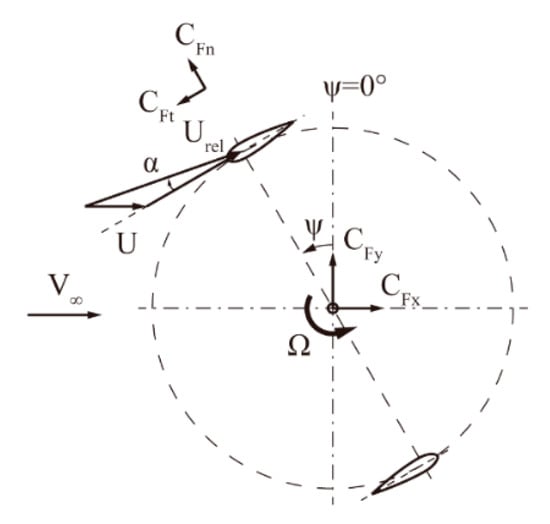 An actuator line model (ALM) was employed in the present study to simulate the aerodynamics of a VAWT because of its high computational accuracy and relatively low cost. Based on computational fluid dynamics (CFD), ALM replaces the displacement boundary conditions of the blades with the body forces using blade element theory (BET). In BET, the aerodynamic forces of the blades are determined by AoAs, which are extracted from the flow field by velocity sampling. Several methods of velocity sampling have been proposed, especially for simulations of horizontal axis wind turbines, such as averaging the velocities adjacent to the blades [,,,] or extracting the flow velocities at monitor points minus the induced velocities by bound circulation [,]. In the present study, the planar velocities in the airfoil profiles at the aerodynamic centers were employed to calculate the AoAs. The previous literature by the authors described the details of the ALM employed, as well as several necessary modifications [], so they are omitted here for brevity.