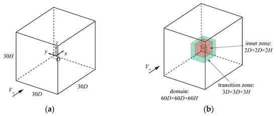 In the present study, the ALM was implemented in the ANSYS Fluent platform together with user-defined functions. A computational domain of was built up to eliminate the blockage effect, and the wind turbine was located at the center (Figure 3a). The boundary conditions were set as follows: a velocity inlet of 7 m/s with a turbulence intensity of 5%, a pressure outlet of zero gauge pressure and symmetry on the other four boundaries. A hexagonal mesh with 1,166,480 elements in total was generated in ANSYS ICEM CFD, which was composed of three zones (Figure 3b). An inner zone of contained the turbine, with an element size of . A transition zone of was adjacent to the former, with a double element size using hanging nodes on the interface between zones. Lastly, an outer zone corresponded to the whole domain, with a quadruple element size growing larger toward the boundaries. The numerical settings in Fluent were decided based on previous studies [,]. The sheer stress transport (SST) k–ω turbulence model and semi-implicit method for pressure-linked equations consistent (SIMPLEC) algorithm were utilized. Other settings can be found in the previous literature of the authors [].
