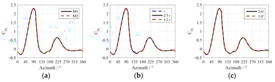 A series of sensitivity analyses of the spatial discretization (mesh element size and blade element length) and temporal discretization (azimuthal angle step size) were carried out, and the instantaneous tangential force coefficients were compared. In terms of the meshes, besides a basic M1 mesh, as mentioned above, a refined M2 mesh was used as a comparison, with a smaller element size of . The total number of elements of M2 was 3,338,616, almost triple that of M1. The results with the two meshes exhibit good conformability in Figure 4a, with a relative error of 0.4% for the average tangential force coefficients. Therefore, the M1 mesh was selected for the following simulations. The blade element length is related to the Gaussian distribution width () in the ALM, which equaled the blade chord length in the present study. Three lengths of , and were chosen, and it was found that the relative errors of the two former lengths, compared to the latter, were 2.6% and 0.6%, respectively (Figure 4b). Thus, the blade element length was set to , corresponding to 27 elements in total for a blade. As for the azimuthal increments, simulations with azimuthal angle step sizes of 2.0° and 1.0° were executed. As shown in Figure 4c, the differences between the two results were quite tiny, with less than a 0.1% relative error. As such, an azimuthal angle step of 2.0° was determined in the present study.