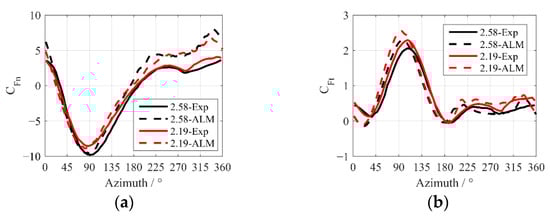 The ALM employed in the present study had been validated in the aspect of power coefficients () of a VAWT for a wide range of tip-speed ratios []. The simulation results by the ALM showed satisfying agreement with the experimental data, especially for moderate-to-high tip-speed ratios. Other than that, the and of a blade on the equator were calculated and compared with the measured ones by Li et al. []. The wind turbine model used in the experiments had a diameter of 2 m and a span length of 1.2 m with two straight blades. The airfoil was NACA0021, and the chord length was 0.265 m. The inlet velocity of the wind tunnel was 8 m/s, and two moderate tip speed ratios, 2.58 and 2.19, were chosen to study. From Figure 5, it is clear that the calculated results fit well with experimental data. To be specific, the peaks of the in the fore half, as well as the in the aft half, were predicted well, but the peaks of the in the fore half and the in the aft half were overpredicted with acceptable errors.