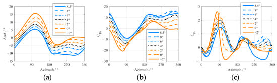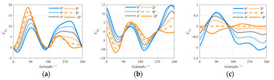 Next, the instantaneous aerodynamic forces, namely the , and , of a blade were examined with fold angles from −2° to 8° (Figure 7). The generally stayed positive in most of the azimuth range. With increasing fold angles, the peaks of the in the fore half reduced, and the climbing of the was delayed. Opposite changes could be seen in the aft half, making the variations of the flatter with larger fold angles. In addition, changes of the in the fourth quartile were greater when compared with those in the third quartile because of the performance in the fore half, similar to . As for the , its direction changed between quartiles. Different from the and , the effect of the fold angle on the was reversed at azimuthal angles of 90° and 270°. The increased in the windward half and decreased in the leeward half with increasing fold angles, which means that the blade folding movement in the positive direction strengthened the lateral force away from the main shaft. Additionally, the occurrence of a stall also resulted in a slight reduction of the . Variations of the showed that the fold angle intensified the fluctuations of . With increasing positive fold angles, the blade experienced larger aerodynamic forces upward in the fore half and downward in the aft half, which was reversed with negative fold angles. Moreover, the effect of the fold angle on the was much stronger in the aft half than that in the fore half.
