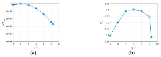 As was mentioned above, the folding movement of the blades led to changes in both the pitch angle and the swept area. Variations of the swept area of the blades could also contribute to the variations in overall performance of the VAWT. However, as can be seen in Figure 8a, the variations of the swept area for fold angles from −2° to 8.5° were less than 0.3%, which could be neglected, suggesting that the variations of the overall performance of the VAWT were mainly owed to pitch movement. Variations of the versus the fold angle are shown in Figure 8b. As can be seen, the maximum was obtained at a fold angle of 4°, and it decreased gradually when the blades were folded in two directions. It is shown that the sensitivity of the to the folding movement in the negative direction was higher than that in the positive direction. However, the occurrence of a stall, caused by large positive fold angles (8.5° in this case), resulted in a sharp drop of the . The findings coincided with previous experimental results [].